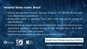 O Hospital Santa Izabel (HSI), situado em Salvador, na Bahia, teve um estudo de caso divulgado em uma publicação internacional feita pela Health Care Without Harm, organização não governamental (ONG) internacional que trabalha em prol da sustentabilidade global no setor saúde em parceria com a Organização Mundial da Saúde (OMS) e o Programa das Nações Unidas para o Desenvolvimento (PNUD).